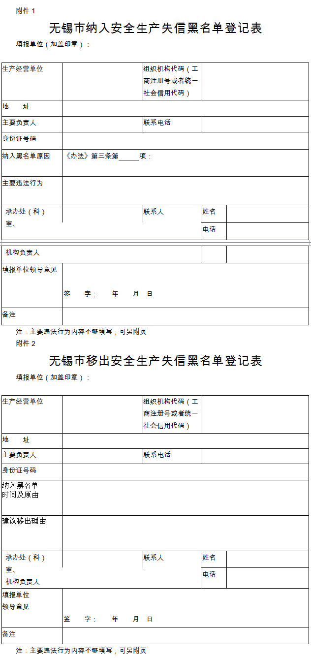 附件:1.無錫市納入安全生產失信黑名單登記表
