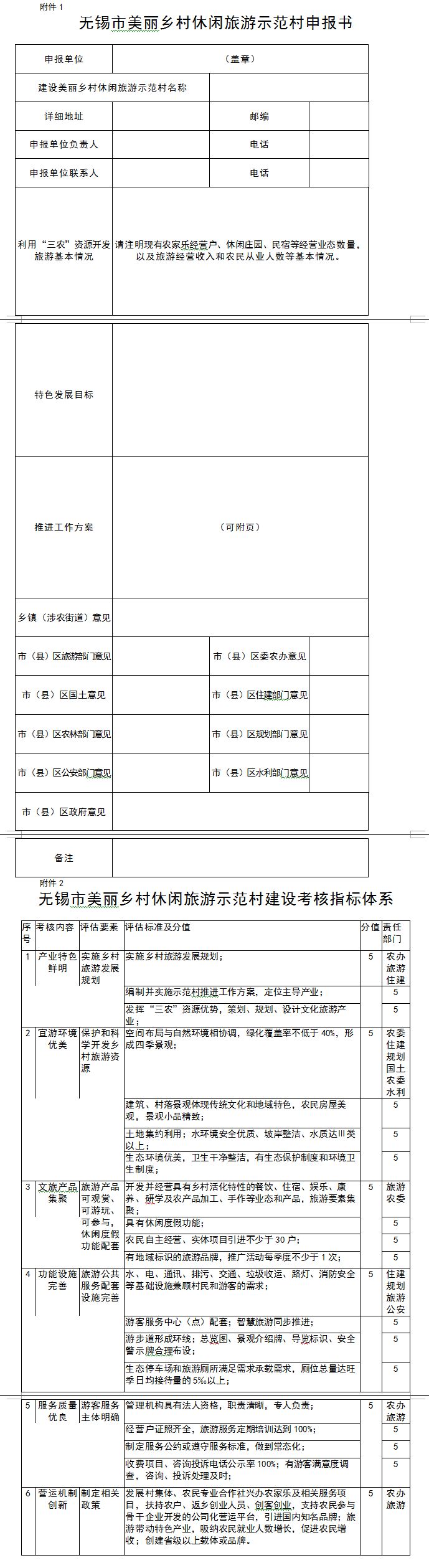 附件:1.無錫市美麗鄉村休閑旅游示范村申報書;