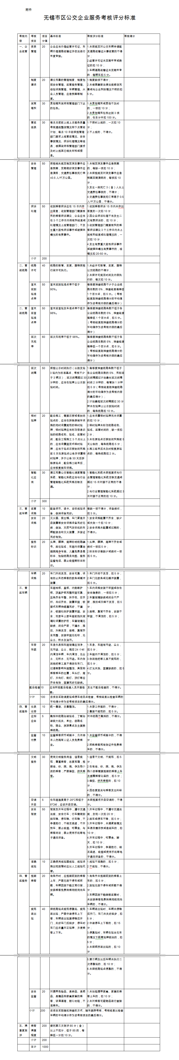 第六條 年度運營服務考核采取千分制考核辦法。主要內容包括:企業運營、營運線路、營運車輛、營運服務、滿意度測評五個方面。詳見附件《無錫市公交企業運營服務考核評分標準》。