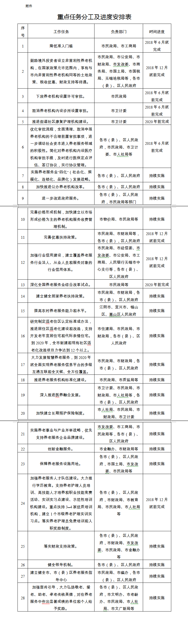 為認(rèn)真貫徹落實(shí)黨的十九大精神,堅(jiān)持以習(xí)近平新時(shí)代中國特色社會(huì)主義思想為指導(dǎo),全面推進(jìn)養(yǎng)老服務(wù)業(yè)新發(fā)展,更好地滿足我市廣大老年人日益增長的美好晚年生活需要,根據(jù)《國務(wù)院辦公廳關(guān)于全面放開養(yǎng)老服務(wù)市場(chǎng)提升養(yǎng)老服務(wù)質(zhì)量的若干意見》(國辦發(fā)〔2016〕91號(hào))、《省政府關(guān)于全面放開養(yǎng)老服務(wù)市場(chǎng)提升養(yǎng)老服務(wù)質(zhì)量的實(shí)施意見》(蘇政發(fā)〔2017〕121號(hào))、《省政府辦公廳關(guān)于制定和實(shí)施老年人照顧服務(wù)項(xiàng)目的實(shí)施意見》 (蘇政辦發(fā)〔2018〕1號(hào))的總體部署,現(xiàn)就全面放開我市養(yǎng)老服務(wù)市場(chǎng),提升養(yǎng)老服務(wù)質(zhì)量提出如下實(shí)施意見。