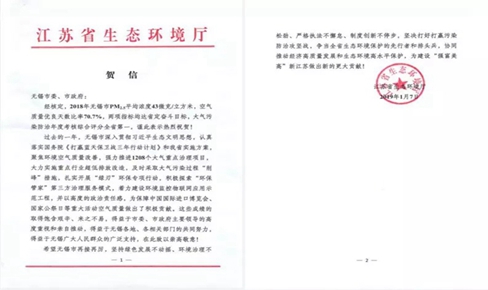 省生態(tài)環(huán)境廳向無錫市委、市政府發(fā)來賀信,