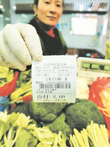 70歲的顧湘英在學前街農貿市場做了20多年生意,這個昔日揚名鄉金星村出身的農家女子頭腦靈活,30年前就來這里提籃賣菜。“那時候我們都有蔬菜田,自己吃不完就來市里賣”,顧湘英說,一開始,這里根本沒有菜場,大家都站在露天,忍受夏日的酷暑、冬日的寒風。她很感慨,“從馬路市場變成真正的菜場,賣菜再也不用那么辛苦了”。而7號攤位的陸去粉是個夫妻檔,現在的攤位面積比原來翻了一番,經營的蔬菜有五六十種,顧客選擇余地大了。攤位打出的收據上,可以看到價格和供應商,并通過溯源系統查到產地等信息,顧客在這里買菜更放心。