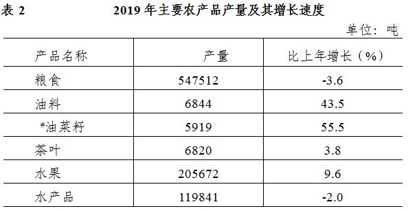 全年糧食總產量54.75萬噸,比上年下降3.6%。預計油料總產量6844噸,比上年增長43.5 %,其中油菜籽5919噸,比上年增長55.5%;茶葉總產量6820噸,比上年增長3.8 %;水果總產量20.57萬噸,比上年增長9.6%。