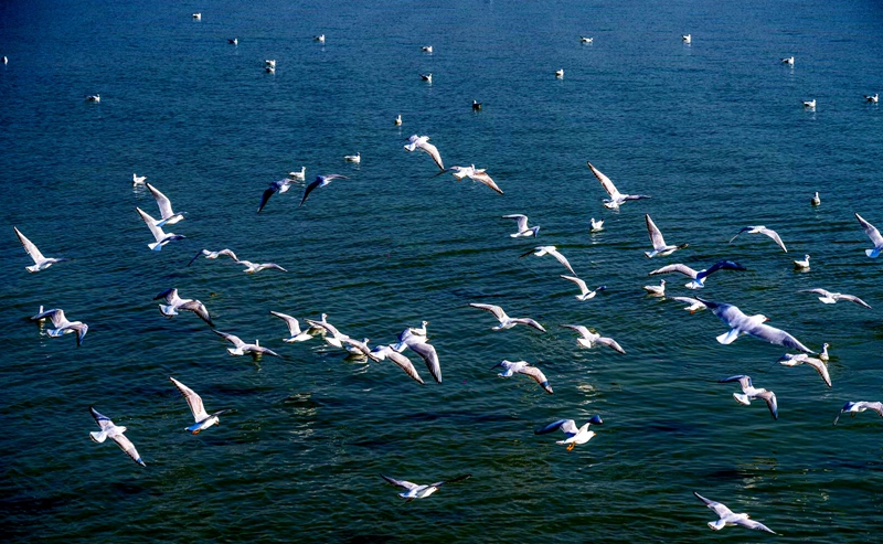 12月4日,大量紅嘴鷗在無錫黿頭渚風景區太湖水面上翱翔。