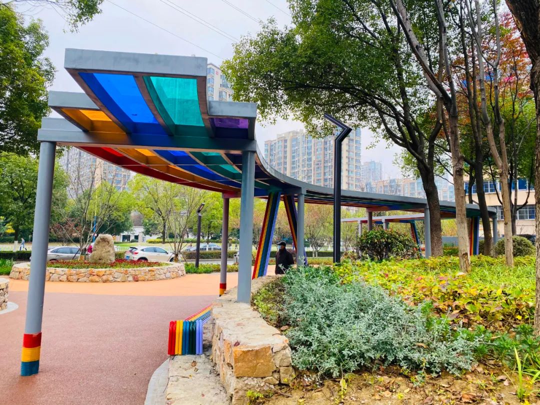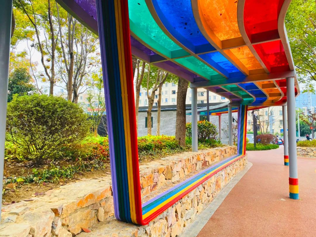 游園中心設置一組由七種顏色組成的鋼結構彩虹廊架,廊架長約20米,兼具休憩功能。