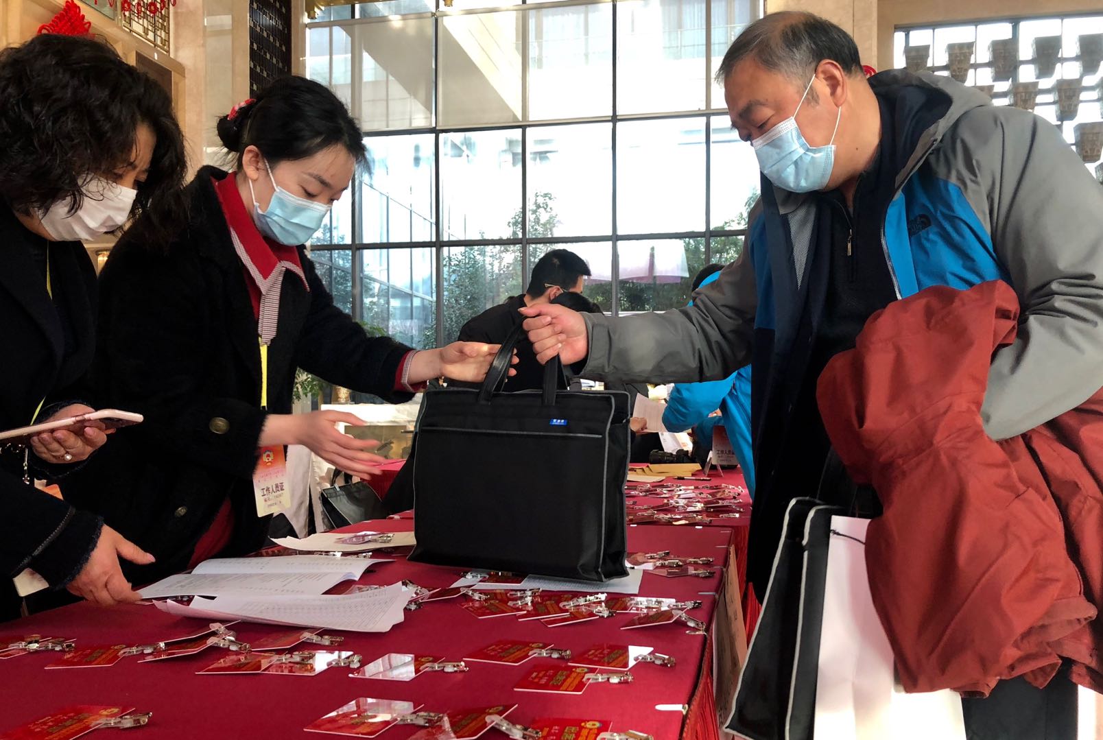 出示“蘇康碼”綠碼,提交了七日內核酸檢測結果、十四天健康監測記錄和個人健康申報承諾書等材料后,前來報到的政協委員們從會務組人員手中領取了大會材料,其中還有一份精心準備的防疫包,內含口罩、消毒濕巾等防疫用品。據介紹,本次會議采取最嚴格防疫程序,實行“進場即封閉”,會議期間全封閉管理,委員們一律集中住宿、集中乘車,會議期間不出駐地、不會客。