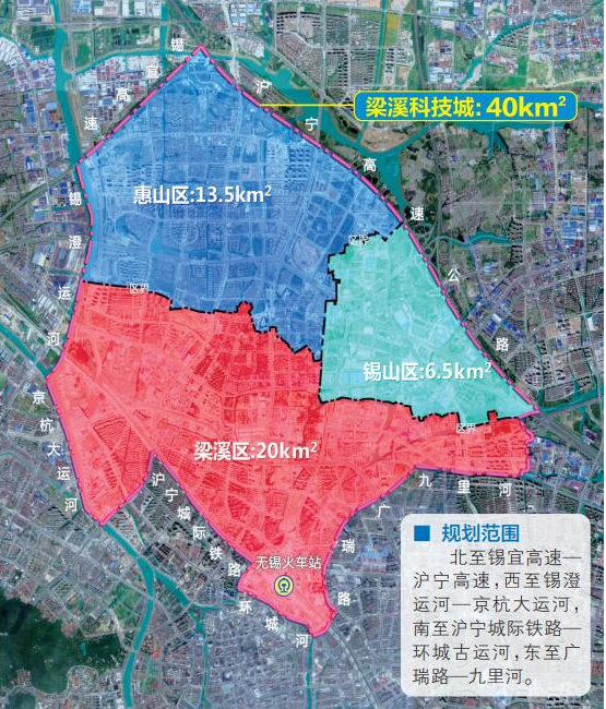 梁溪科技城規(guī)劃編制范圍位于老城區(qū)北部的三區(qū)交界之地,北至錫宜高速—滬寧高速,西至錫澄運河—京杭大運河,南至滬寧城際鐵路—環(huán)城古運河,東至廣瑞路—九里河,總面積約40平方公里。其中,梁溪區(qū)20平方公里,惠山區(qū)13.5平方公里,錫山區(qū)6.5平方公里。此次招標的內(nèi)容,不僅包括梁溪科技城概念規(guī)劃,還包括對10平方公里核心區(qū)開展概念性城市設(shè)計,并在核心區(qū)范圍內(nèi)選取1—2平方公里區(qū)域作為科技城核心啟動區(qū),開展詳細城市設(shè)計。