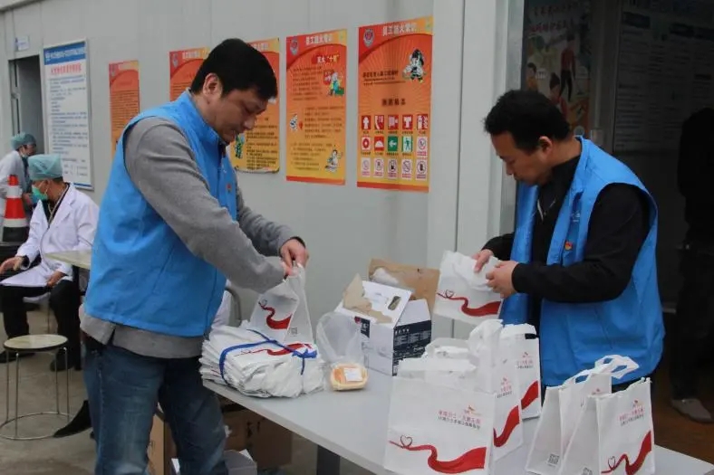 在活動現場,捐贈中心黨員發(fā)揮先鋒模范作用,帶領“志愿服務”星團隊成員,協(xié)助醫(yī)護人員搭好檢測臺,引導建設工人依序體檢,并發(fā)放營養(yǎng)早餐,確保活動有序開展。