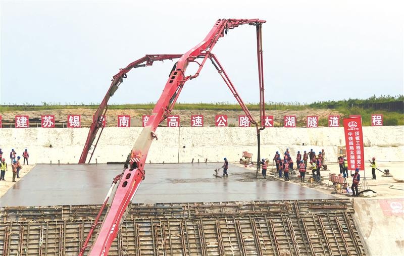 伴隨著28名施工人員和泵車長達20個小時的連續作業,澆筑、攤鋪反復多次,約1750立方米的混凝土澆筑至太湖隧道南泉段第6倉頂板上。昨天上午11點左右,最后一方混凝土從罐車澆向作業面,太湖隧道南泉段主體結構竣工,長達10.79公里的湖底隧道實現南泉段全“閉合”。蘇錫常南部高速公路全線預計年內可交工投用。