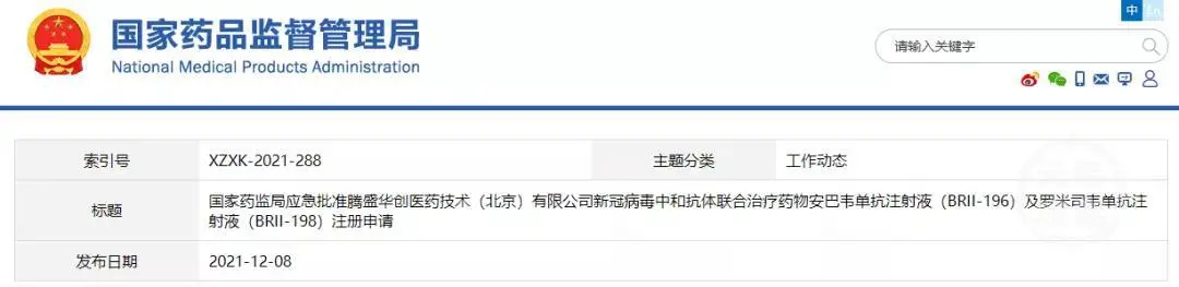 當天,國家藥品監督管理局應急批準騰盛華創醫藥技術(北京)有限公司新冠病毒中和抗體聯合治療藥物安巴韋單抗注射液(BRII-196)及羅米司韋單抗注射液(BRII-198)注冊申請,這是我國首個獲批的自主知識產權新冠病毒中和抗體聯合治療藥物。