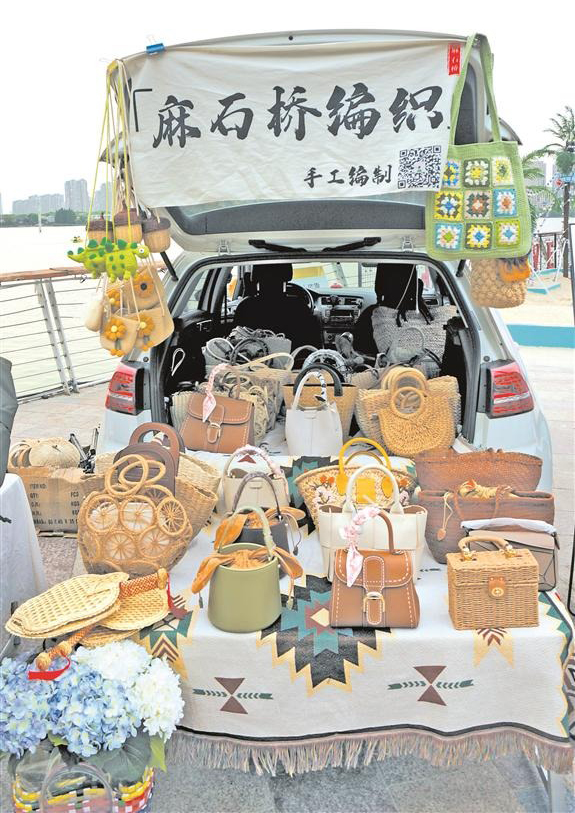 “想著做點什么,補貼一點家里”,艷艷在2020年疫情發(fā)生之后就開始了第一次擺攤,最初是在步行街租了一個固定的攤位,今年看到有朋友做起了后備廂擺攤,她觀望了一陣子覺得很有意思,也加入了進(jìn)來。“最大的好處是沒什么成本,只要一輛車,有一點自己的貨源就能做起來。”后備廂前支一張桌子,把編織包和皮包分門別類放好,再把織有俏皮圖案的童趣包單獨拿出來掛在車子兩邊,短短20分鐘,一箱子包包在艷艷熟門熟路的布置下,變得錯落有致起來。擺放的過程中,不時有路人上前試背。攤位上,除了擺有收款碼,艷艷還貼出了自己的微信二維碼,不少客戶從線下轉(zhuǎn)到了線上,從過路客變成了朋友圈里人。“在公司上班比較乏味,下了班到這里看看湖光水色和嬉笑人群,是一件很解壓的事,在這過程中也能認(rèn)識很多朋友”,艷艷很享受這份舒心愜意。抱著這樣的心態(tài),再熱的天出攤,她也不覺得辛苦。