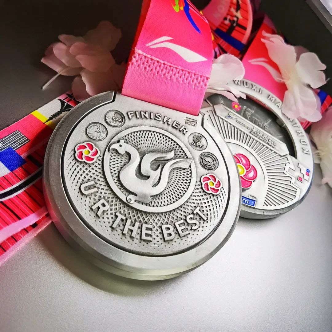 無錫馬拉松被譽(yù)為“春天第一跑”,跑友們又親切地稱之為“櫻花馬”,因為比賽的季節(jié)正值全城櫻花爛漫。即便今年的錫馬延期到了秋天,完賽獎牌《綻放》依然少不了櫻花。獎牌正面首先映入眼簾的便是一朵綻放的櫻花,上半部分還有一個特別的凹窩,如一汪清淺的湖水,靜靜漂浮著點點櫻花。獎牌的背面則是無錫的城市徽標(biāo)“玉飛鳳”,代表著這座古老城市的歷史傳承與文化底蘊(yùn)。