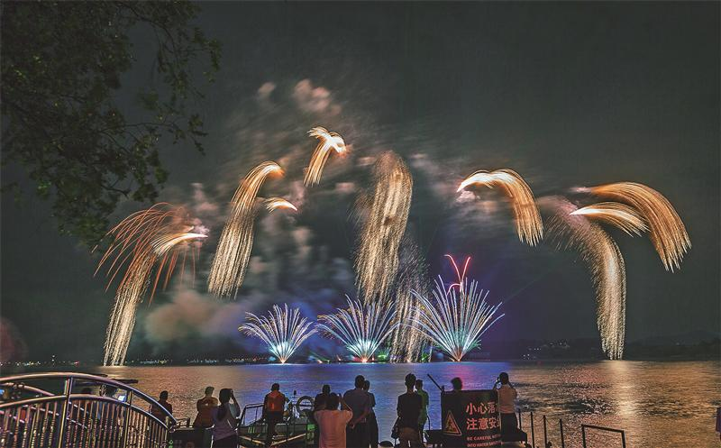 禮贊祖國,華夏共賀。整整五日,太湖夜空,都將點綴著五光十色的焰火,縈繞著靈動躍然的音樂旋律。泛舟太湖,遙望煙花與音樂共譜舞曲。火樹銀花照亮迢迢銀河的同時,也映照出光影里的巧笑倩兮。這是黿頭渚為游客送上的佳節(jié)厚禮,愿如此良辰美景,可與世人共享。