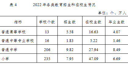 全市共有普通高校13所。普通高等教育本??普猩?.16萬人,在校生15.41萬人,畢業生3.80萬人;研究生教育招生0.42萬人,在校生1.22萬人,畢業生0.27萬人。全市中等職業教育在校生5.22萬人。九年義務教育鞏固率100%,高中階段教育毛入學率99.5%,普及高中階段教育。特殊教育招生366人,在校生1584人。全市共有幼兒園596所,比上年增加16所,在園幼兒21.72萬人,比上年增加0.34萬人。