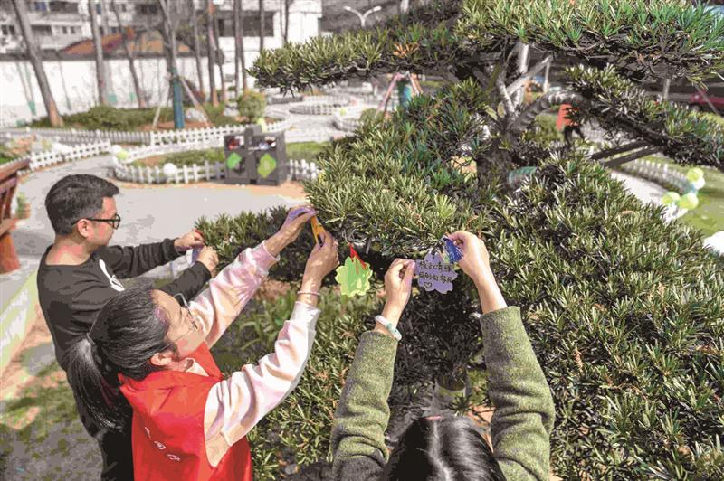 昨日,靖海新村社區開展“綠色認養 踐行環保”文明實踐活動,社區工作人員與轄區居民一起認養樹木、掛家風寄語卡片,用實際行動弘揚綠色生態理念。(朱吉鵬 攝)