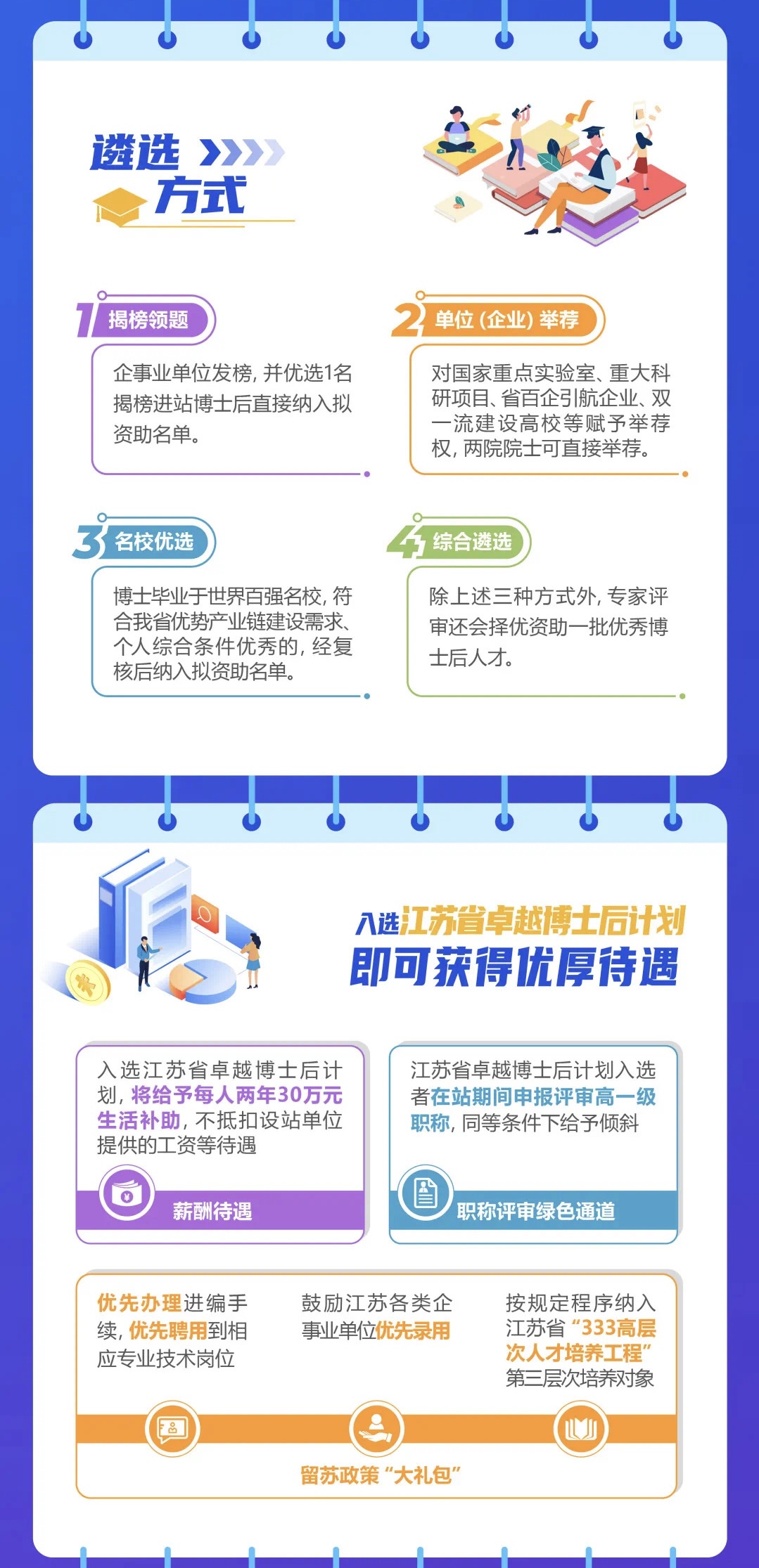 實施卓越博士后計劃,吸引集聚博士后開展“卡脖子”技術攻關,圍繞產業鏈布局人才鏈,培養造就一批進入世界科技前沿的優秀青年科技人才,是我省新時代人才強省建設的戰略舉措。據悉,對于每名入選者,省財政按兩年共30萬元標準,分年予以資助,資助經費主要用于入選者的生活補助,不抵扣設站單位提供的工資等待遇。除了真金白銀,還強化人才留蘇集成配套激勵,明確入選者出站留蘇的,按規定程序納入江蘇省“333高層次人才培養工程”第三層次培養對象;入選者出站到事業單位工作的,優先辦理進編手續,優先聘用到相應專業技術崗位。