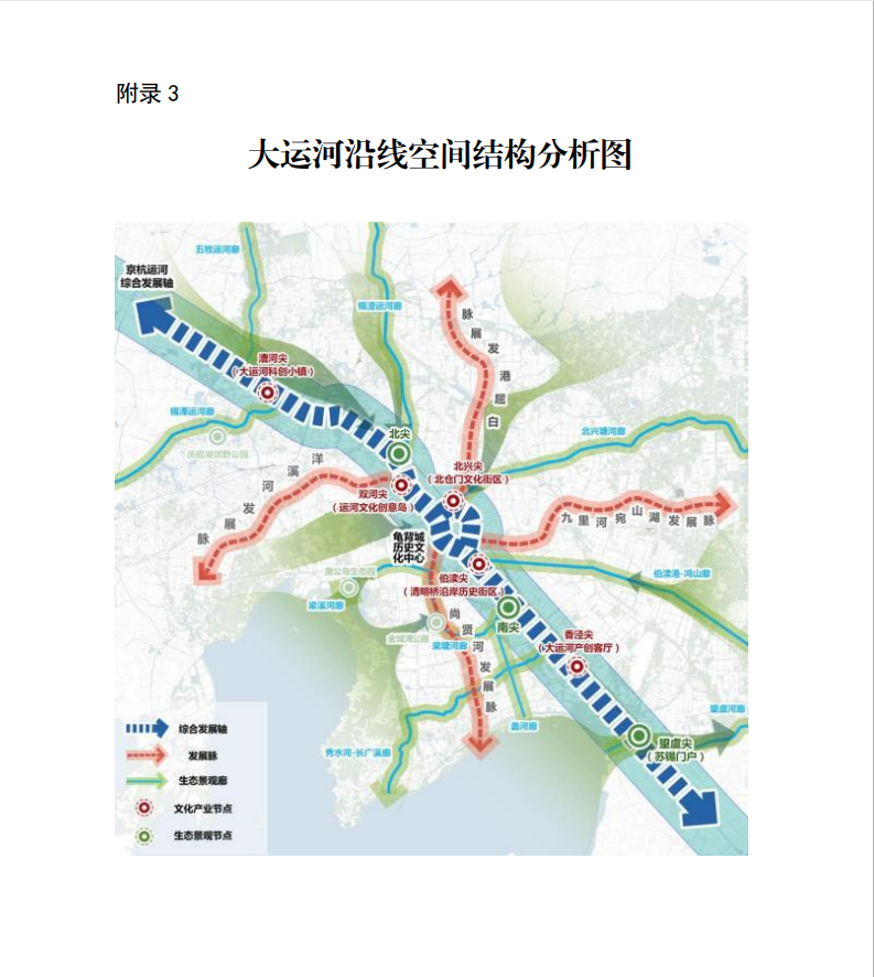第十四條 優(yōu)化空間布局。在國土空間規(guī)劃中統(tǒng)籌劃定永久基本農(nóng)田、生態(tài)保護紅線、城鎮(zhèn)開發(fā)邊界,圍繞“文化傳承、運河興城”的總體目標,協(xié)調(diào)好文化遺產(chǎn)保護、生態(tài)保護和開發(fā)利用與大運河文化保護傳承利用的關系,打造大運河綜合發(fā)展軸,穩(wěn)定水網(wǎng)空間,拓展綠色廊道,挖掘文化資源,強化河口、河尖節(jié)點塑造,優(yōu)化“生態(tài)、生活、生產(chǎn)”三生空間布局,形成兼具經(jīng)濟發(fā)展、文化展示、生態(tài)產(chǎn)品價值實現(xiàn)與流量儲備的復合型區(qū)域。