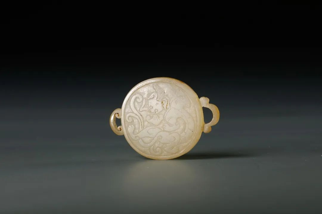 飾片白玉質地,呈扁圓形,背面光素。上下有如意形系,上系兩端向外翻,下系向內卷。邊緣較寬,線條簡潔,剔地淺浮雕加細陰刻線。主題紋飾為蟠螭紋,螭身卷曲翻騰狀,尾長分為兩股三叉,形態生動,大眼大耳,口咬靈芝,頭頂毛發上沖飄逸。此器系元代錢裕墓出土,為元代典型的玉飾件,玉質佳、工藝精。
