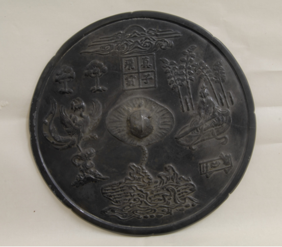無錫博物院藏“真子飛霜”鏡鈕的最上方繪有一片祥云,月亮正從云中慢慢升起,在云海下方有一田字格,格中“真子飛霜”四字。圖案下方為一潭水波蕩漾的蓮花池,池中徐徐升起一片荷葉,上面還托起一只烏龜,荷葉作銅鏡的鈕座,烏龜作鏡鈕,構思巧妙而自然。在鏡鈕的右側有一頭戴華冠、褒衣博帶、端坐撫琴的高士,在他的身后是一片茂密的竹林和新生春筍,高士面前置有一張長條幾案,上面擺著書卷、硯臺、香爐,清雅閑適。與高士相對的左側,有一只振翅欲飛、翹首顧盼的鳳凰立于山石之上。