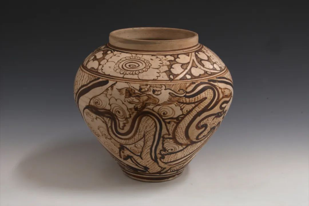 直口,短頸,豐肩,肩部以下漸收斂,圈足。外壁通體白地黑花裝飾。肩部兩組弦紋間繪纏枝菊紋,腹部兩組菱形開光:一面繪游龍,龍目圓睜,龍發飄逸,龍身卷曲,神態莊嚴又不失親和;另一面繪飛鳳,兩翼展開,鳳尾在身后舒展,呈展翅翱翔狀,畫面靈動飄逸。龍鳳紋的線條粗重,部分區域用褐彩填涂,以線勾云紋為背景襯托,增加了圖案的厚重和突出感。整體造型質樸莊重,構圖粗獷奔放,龍鳳形象活潑生動,表現出磁州窯獨具特色的裝飾風格。