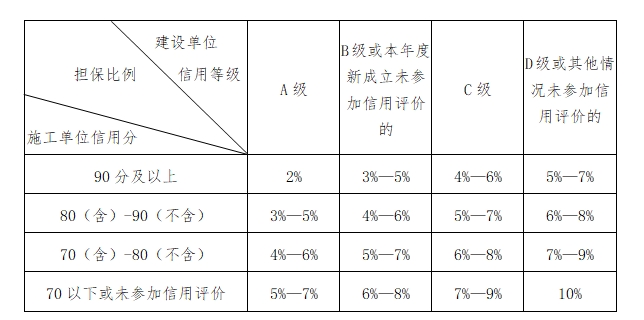 (二)房地產開發項目工程款支付擔保根據建設單位和施工單位的信用情況采用分級管理,具體擔保比例由建設單位和施工單位按照下表范圍在承包合同中約定: