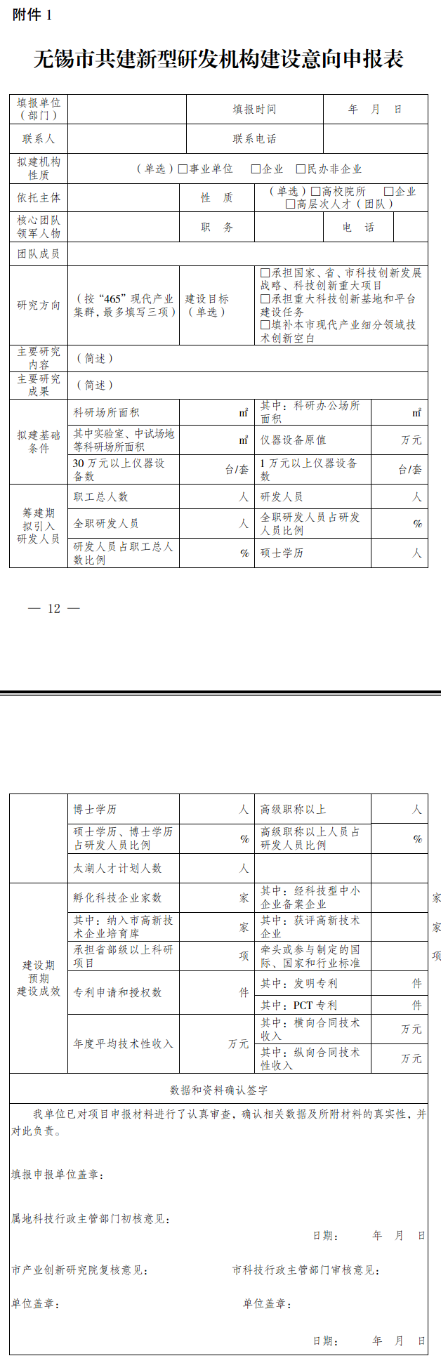 附件:1.無錫市共建新型研發(fā)機(jī)構(gòu)建設(shè)意向申報(bào)表