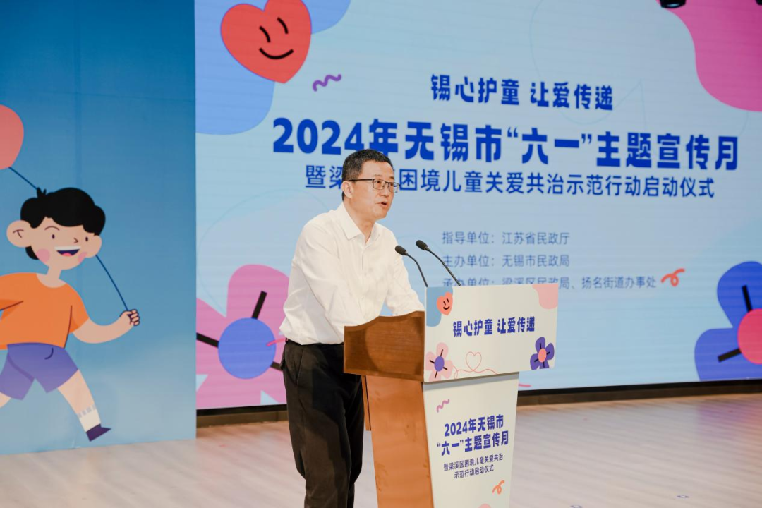 無錫市民政局黨委書記、局長周立軍在致辭中表示:近年來,在省民政廳、市委市政府的正確領導下,我市兒童福利工作取得長足發展,困境兒童精準保障逐步健全,全市孤兒養育平均標準持續位居全省前列,在全省首個探索“慈善+兒童”融合模式,設立“事實無人撫養成長關愛計劃”等3項市級兒童福利類慈善項目,打造省級“蘇童成長”梁溪示范點,已建成省級示范性鎮(街道)未保站(關愛之家)40家。今年我局牽頭啟動了留守兒童和困境兒童關愛服務質量提升三年行動,全市各級民政部門要借此機會,持續深化“主動發現”機制,加強提升困境兒童等特殊兒童群體關愛服務質量;希望全市廣大兒童工作者一起構建兒童“大保護”工作格局,協力共護無錫困境兒童健康成長。