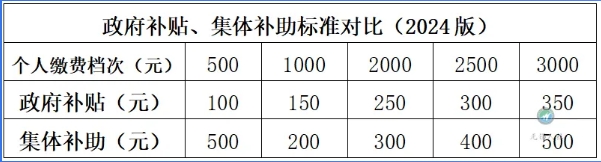 有條件的村級集體經濟組織對當年參加城鄉居民基本養老保險繳費的本集體經濟組織內成員給予補助,對政府全額代繳的500元檔,集體補助500元;對1000元、2000元、2500元、3000元檔,分別補助200元、300元、400元和500元。