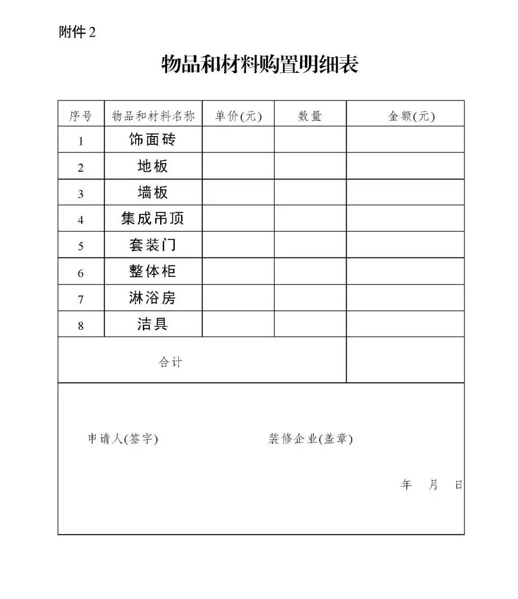 2024年7月25日(含)至2024年12月31日(含)期間簽訂住宅裝修協議,由裝修公司代為購置用于舊房(包括城鎮住宅和農村住宅)裝修、廚衛等局部改造所需的物品和材料,包括飾面磚、地板、墻板、集成吊頂、套裝門、整體柜、淋浴房、潔具。