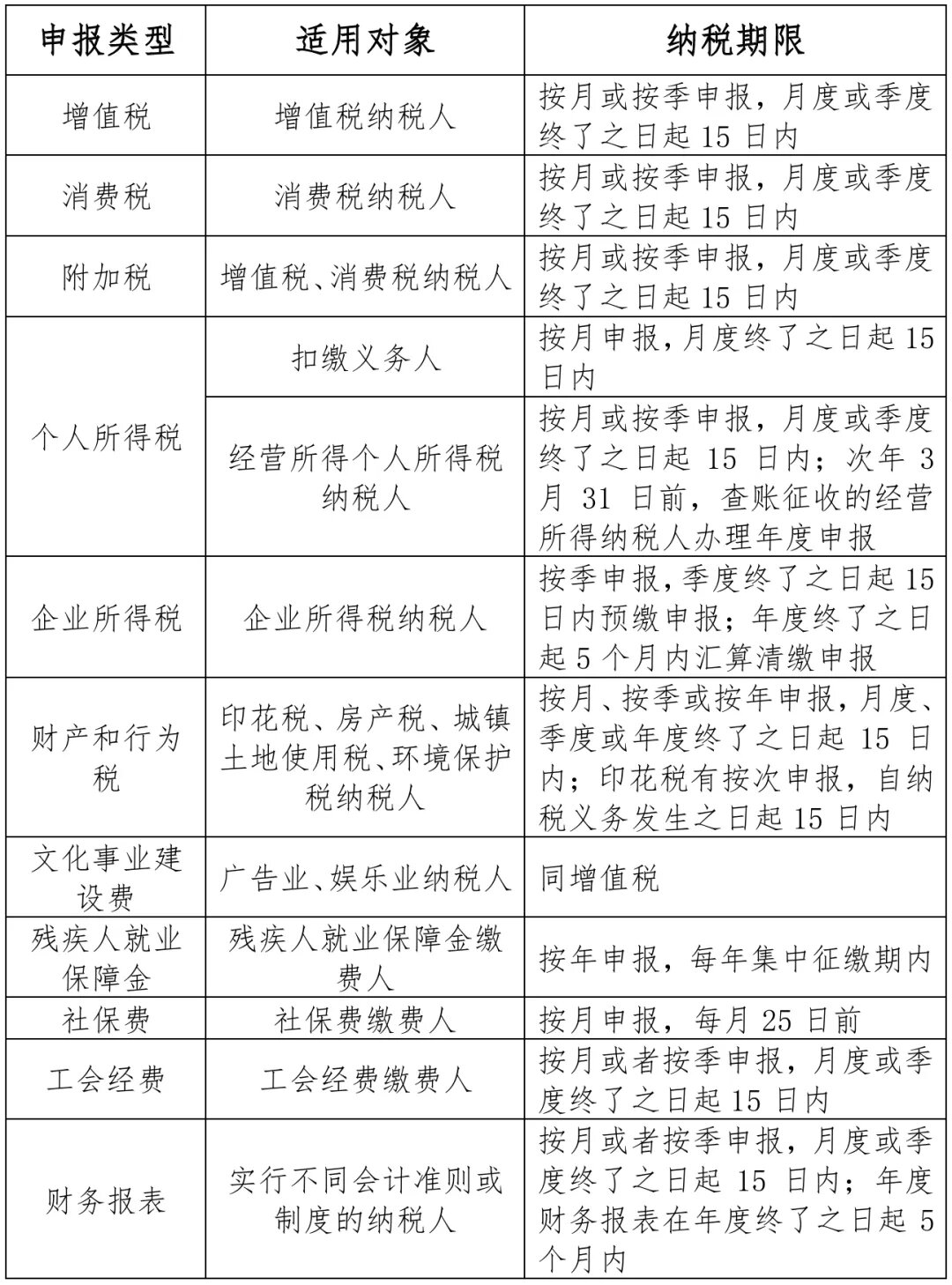 注:申報期最后一日是法定休假日的,以休假日期滿的次日為期限的最后一日;在期限內有連續3日以上法定休假日的,按休假日天數順延(社保費除外)。