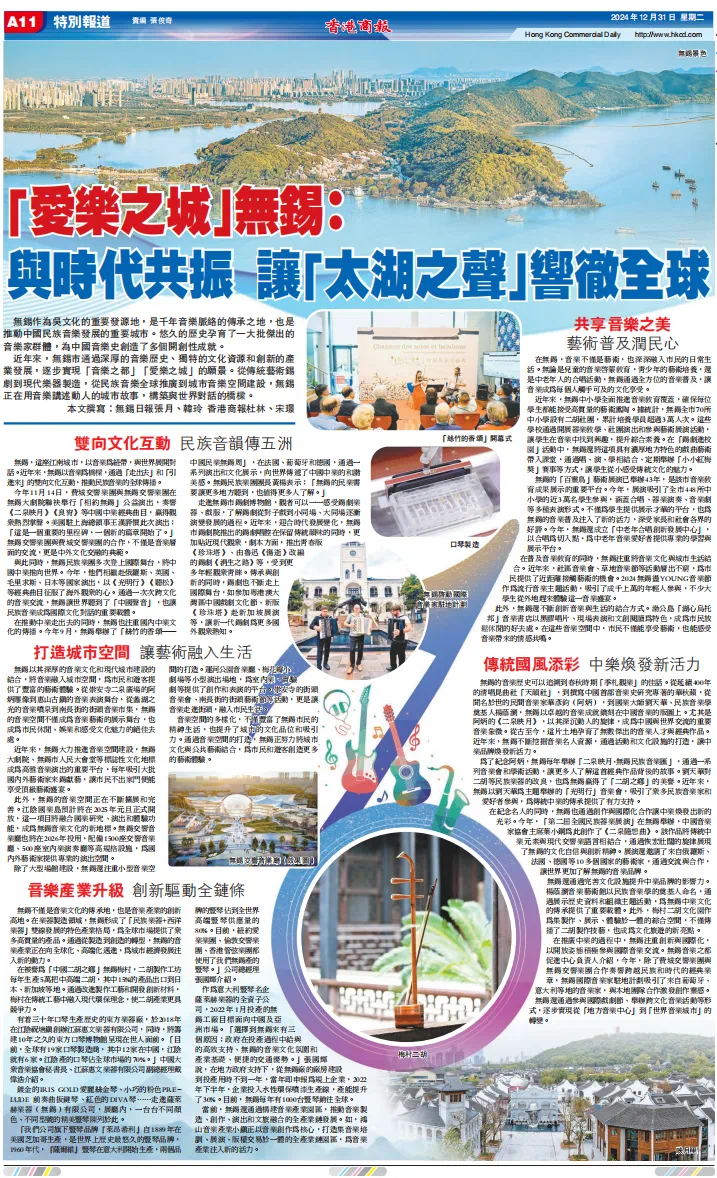 12月31日,中國香港歷史最悠久的中文財經報章《香港商報》整版刊登4000字綜述《“愛樂之城”無錫:與時代共振 讓“太湖之聲”響徹全球》,從音樂文化交流、城市音樂空間打造、音樂產業躍升、音樂藝術普及、民樂品牌煥新五個維度詳述無錫作為“愛樂之城”,如何以音樂講述動人的城市故事,構筑起與世界對話的橋梁。