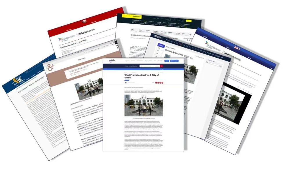 此外,近期,全球通訊社聯盟發布的消息《Wuxi Promotes Itself as A City of Music》(中譯文:《無錫打造音樂之都》)在歐美、亞太地區以英語、德語、法語、日語、韓語5種語言同時發布,并被福克斯有線電視網、美國廣播公司、韓聯社、共同社、《朝日新聞》等全球主流媒體、門戶網站及重點資訊網站廣泛轉載落地,總量達739家次。