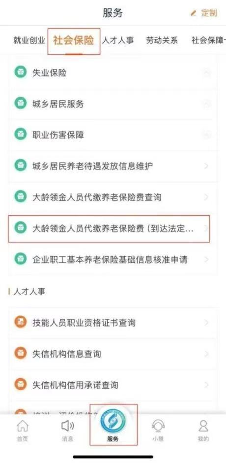 線上渠道1:登錄“江蘇智慧人社”APP,依次點(diǎn)擊“服務(wù)—社會保險—大齡領(lǐng)金人員代繳養(yǎng)老保險費(fèi)(到達(dá)法定退休年齡申請)”模塊。