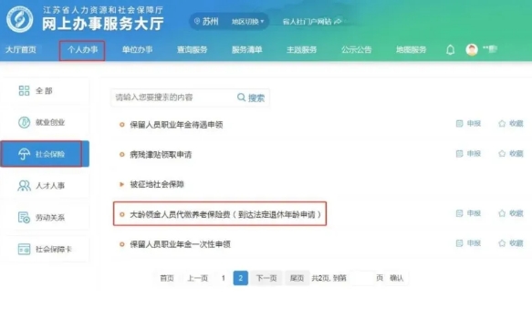 線上渠道2:登錄江蘇人社網(wǎng)上辦事服務(wù)大廳(網(wǎng)址:https://rs.jshrss.jiangsu.gov.cn)(將地區(qū)設(shè)置為“無錫”),依次點(diǎn)擊“個人辦事—社會保險—大齡領(lǐng)金人員代繳養(yǎng)老保險費(fèi)(到達(dá)法定退休年齡申請)”模塊。