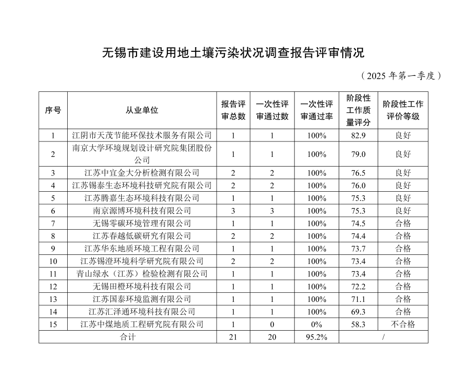根據《無錫市建設用地土壤污染狀況調查從業單位工作質量評價辦法(試行)》,我局對全市2025年第一季度建設用地土壤污染狀況調查報告評審情況進行了匯總,相關情況公示如下: