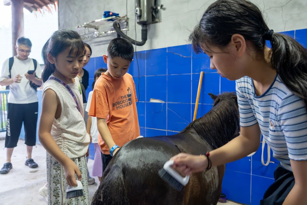 在保育員指導下為矮馬沖涼、刷背,