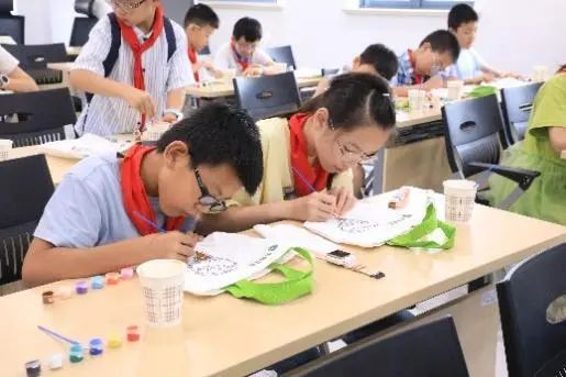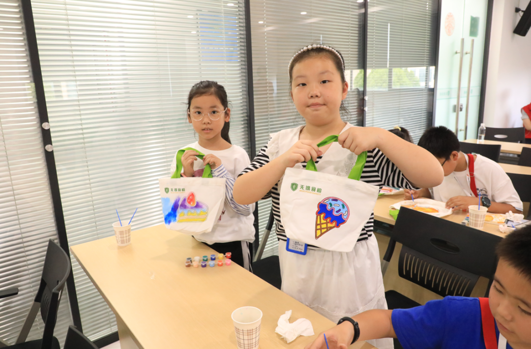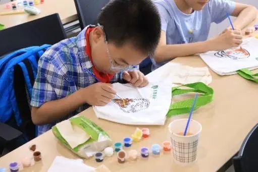 帆布包彩繪環節充滿歡聲笑語。孩子們為蛋糕、飯團等食物線稿填色,用繽紛色彩詮釋對健康飲食的理解,一幅幅童趣作品成為難忘的暑期記憶。