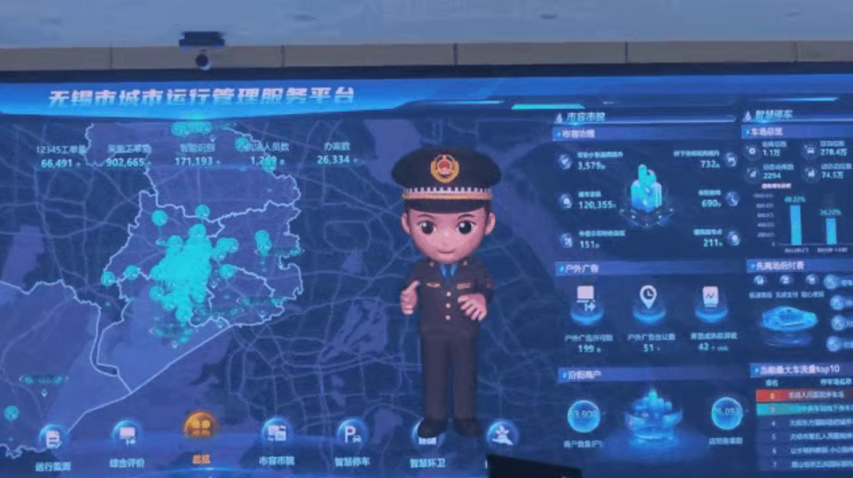步入大廳,無錫城管數字人正為大家介紹無錫城市運行管理服務平臺的建設和運行情況,揭秘平臺如何圍繞“高度集成、高效指揮、高能支撐”開展工作。