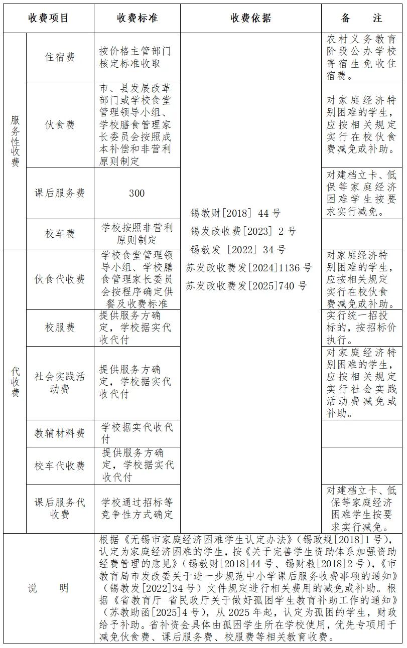 無錫市區公辦小學收費表