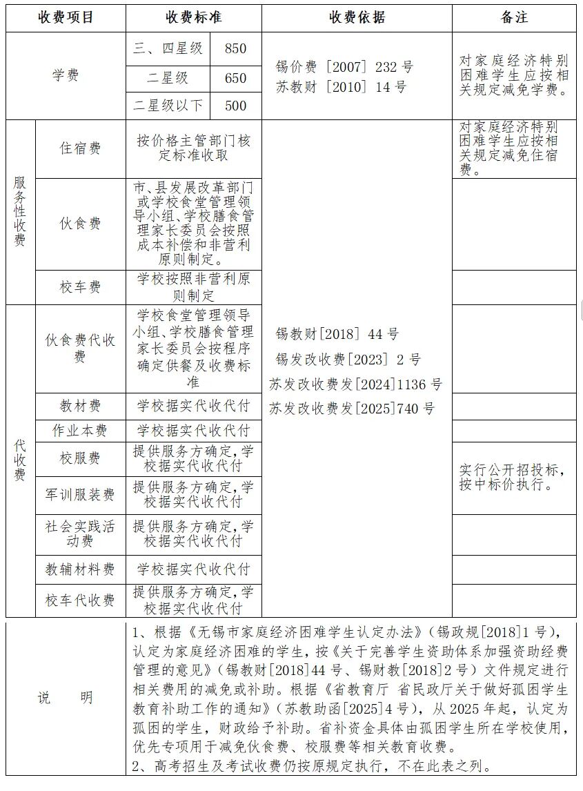 無錫市區公辦普通高中收費表