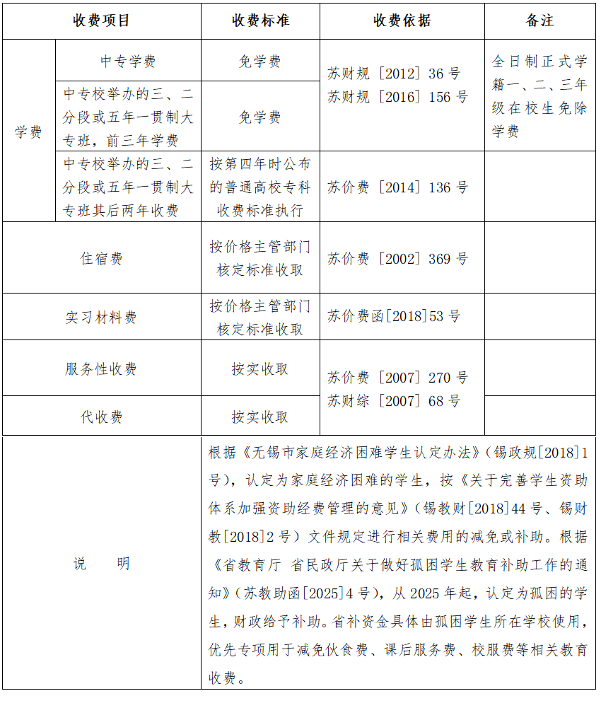 無錫市公辦中等職業學校收費表