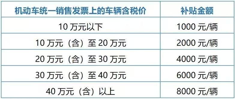 審核通過后,按機動車銷售統一發票上的購車價格(含稅價),分別給予一次性補貼。 ![]()