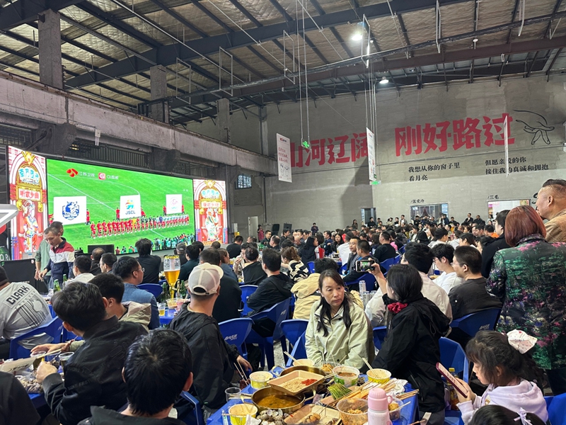 溪南公館大世界影城里也聚起不少觀賽的市民。李先生帶著孩子早早來到影廳中央位置,他們的臉上難掩期待:“我們家都喜歡足球,在電影院里看比賽,不僅有超大銀幕和震撼音效,還可以和球迷們交流,舒適度和氛圍感都很好。”觀賽活動(dòng)不僅讓市民過足癮,也為商家?guī)砹藢?shí)實(shí)在在的流量“紅利”。那天以后·重慶燒烤海鮮溪南公館店內(nèi)座無虛席,客人們吃烤串、喝啤酒、看球賽,一起為無錫隊(duì)干杯,喝彩聲和歡笑聲此起彼伏。“客流量、酒水銷售額均比沒有賽事的普通周日增長了50%。”店長徐培生認(rèn)為,“蘇超”這股熱勁把人氣實(shí)實(shí)在在帶到了線下。為讓廣大球迷更直觀感受“第二現(xiàn)場”氛圍,門店在大廳里裝了3塊直播大屏,在每個(gè)包廂里也都安排了電視直播,確保每個(gè)位置都能享受比賽。