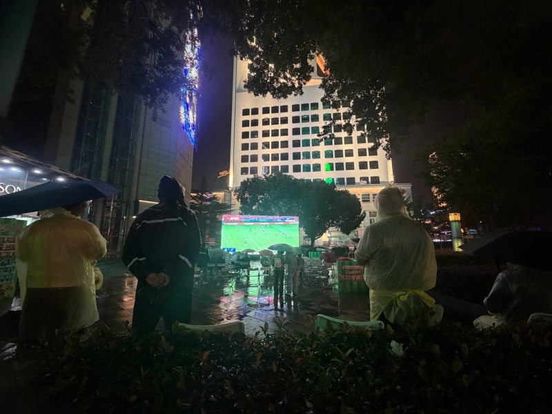 雨中,二泉廣場、三陽百盛等“蘇超”線下觀賽點(diǎn)依舊熱火朝天。露天觀賽區(qū)內(nèi),球迷們或撐傘駐足,或身著雨衣沉浸其中,每一次精彩的傳球都引來陣陣歡呼。人群中,無錫隊(duì)的“鐵桿粉絲”朱新輝格外引人注目:“無錫隊(duì)的比賽,我場場都在‘第二現(xiàn)場’觀賽。和這么多朋友一起吶喊助威,這種氛圍是電視轉(zhuǎn)播無法替代的。”