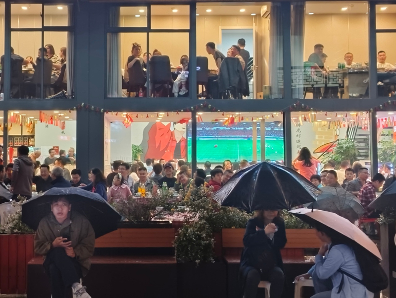 顯云街因“蘇超”半決賽而沸騰。夜幕降臨,一塊塊各具特色的招牌漸次亮起;亭臺(tái)中央,檐角下的直播大屏實(shí)時(shí)傳遞著“蘇超”賽場上的激情。盡管細(xì)雨不停,但大屏對(duì)面的外擺區(qū)域仍然坐滿了顧客。比賽進(jìn)入膠著時(shí)刻,整條街便化作了露天劇場,球迷的心臟隨著攻防轉(zhuǎn)換共同跳動(dòng),不少躲雨的行人也加入助威行列。“店內(nèi)店外都坐滿了人,相較于以往的雨夜,客流增長了超50%。”大屏正對(duì)面的天府龍蝦烤全羊店內(nèi)同樣播放起了“蘇超”賽事,老板娘薛尤介紹,兩塊直播大屏對(duì)門店客流帶動(dòng)效果明顯,有無錫隊(duì)比賽的夜晚場場爆滿。