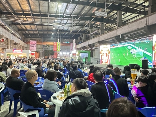在1969創(chuàng)意工場南方夜市,空氣里彌漫著油炸的焦香和沸騰的人聲,夜市中央的巨型大屏前座無虛席。賣舟山鐵板魷魚的潘先生忙得頭也不抬:“球迷們一邊吃一邊看,時(shí)不時(shí)還要點(diǎn)單,今天的生意比平時(shí)好了不少。”對(duì)面手打檸檬茶的攤位上同樣火爆,光檸檬就消耗了50斤,補(bǔ)了三四次茶葉,平時(shí)一晚上賣出三四桶,當(dāng)天賽事剛開始,第六桶便已見底。南方夜市商家們?cè)诒WC食品安全的基礎(chǔ)上全力增加了備貨量,保障球迷吃喝一應(yīng)俱全。球迷顏亞鵬和3位朋友圍坐一起,桌上擺滿啤酒和烤串、炸薯?xiàng)l等各色小吃。“我們傍晚6點(diǎn)多就來占位子了,這種比賽,就得在夜市看,最有氛圍。”