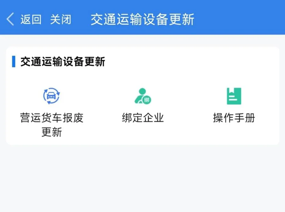 2.實名認證后點擊“交通運輸設備更新”,先選擇綁定企業,再進行申報。