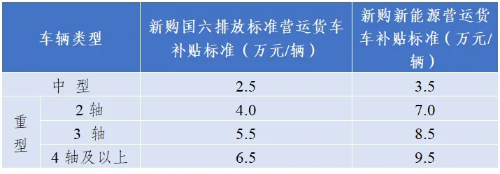 3.對距離強制報廢年限不滿一年的國四及以下排放標準營運貨車實施報廢,并新購中重型國六排放標準貨車或新能源貨車的,按照新購補貼標準予以補貼;對掛車不予補貼。