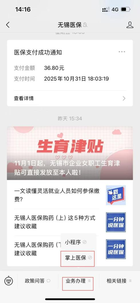 以“無(wú)錫醫(yī)保”微信公眾號(hào)為例,關(guān)注公眾號(hào)進(jìn)入主頁(yè)后,下方選擇“業(yè)務(wù)辦理”,點(diǎn)擊“掌上醫(yī)保”。