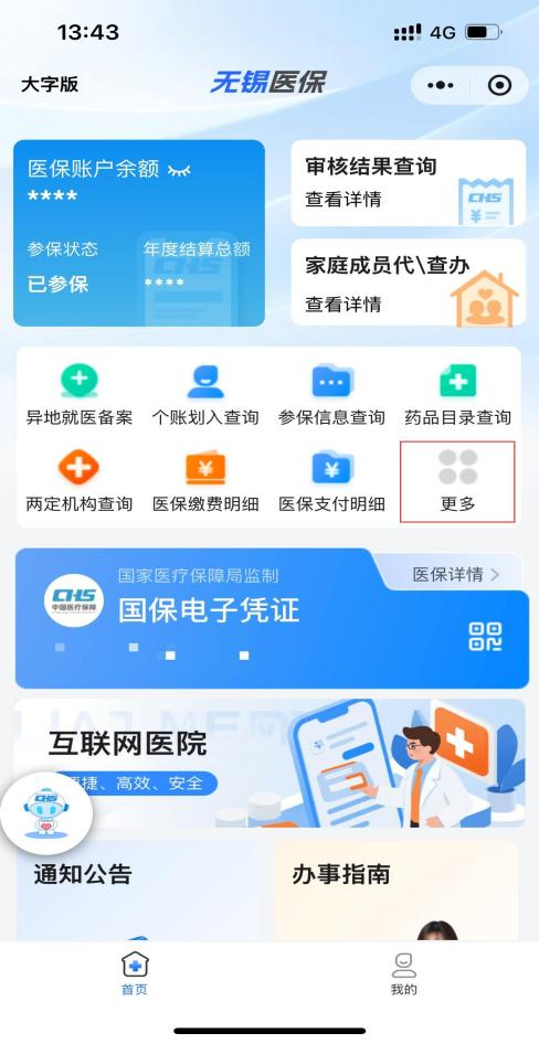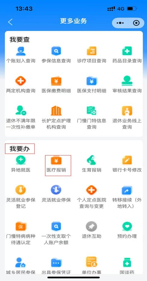登錄個(gè)人賬戶后,點(diǎn)擊“更多”在“我要辦”模塊選擇“醫(yī)療報(bào)銷”,進(jìn)入報(bào)銷界面,勾選報(bào)銷須知后點(diǎn)擊“下一步”。